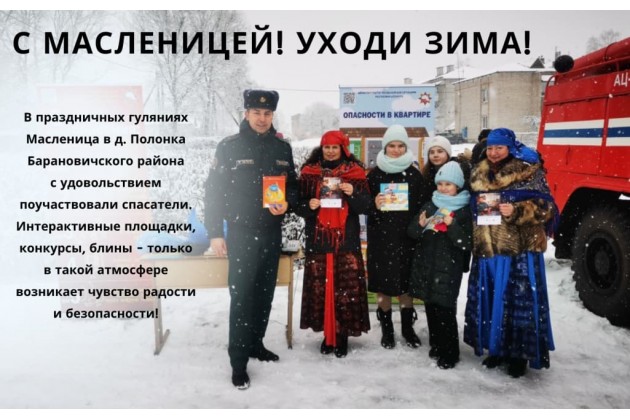 25 февраля 2023 года старший инспектор сектора пропаганды и взаимодействия с общественностью Барановичского ГРОЧС вместе с отделением пожарных-спасателей пожарного аварийно-спасательного поста д. Полонка участвовали в праздничных гуляниях «Масленица», организованных работниками Полонковского клуба отдела культуры Барановичского района и Полонковским сельским исполнительным комитетом, при поддержке торговой сети ОАО «Птицефабрика «Дружба».