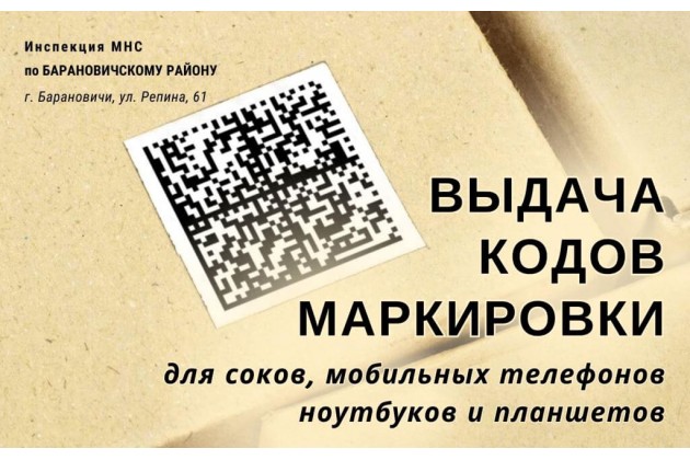 Выдача кодов маркировки для соков, мобильных телефонов, ноутбуков и планшетов ИМНС Барановичского района