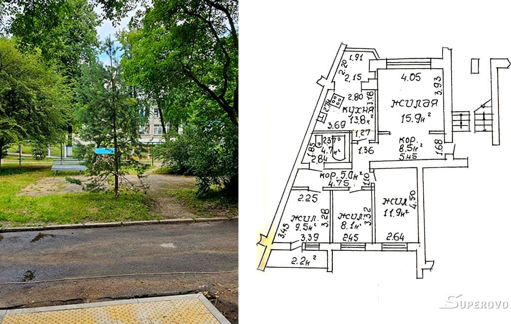 Кирпичный дом 1985 г.п. Квартира находится на первом высоком этаже 5-этажного дома.